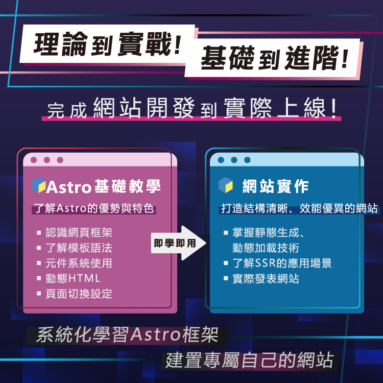 本課程獨家推出,由資深工程師親授,帶您深入淺出學習當紅的 Astro 框架。課程內容從基礎到進階,全面涵蓋,並結合豐富的實戰專案,讓您從理論到實作,快速掌握靜態生成與動態加載等關鍵技術。透過本課程,您將能即學即用,打造出高性能、高品質的現代化網站,為您的開發生涯增添亮點。