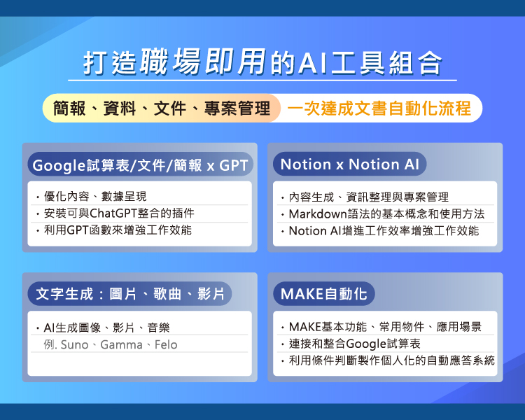 - AI 文書力一次整合:GPT × Google × Notion × MAKE,打造完整工作鏈。