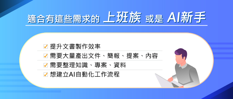 - 結果導向學習:學完能直接產出個人知識庫、智能文書與自動化流程。