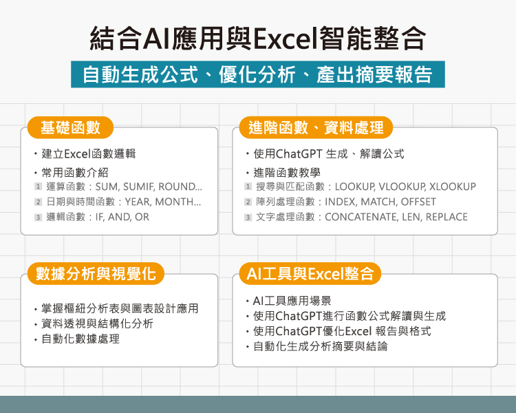 - 零基礎也能快速掌握:從基礎函數到 AI 報表循序漸進。